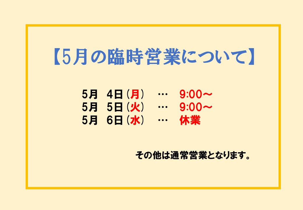 GW期間中の臨時営業の予定をお知らせ致します。